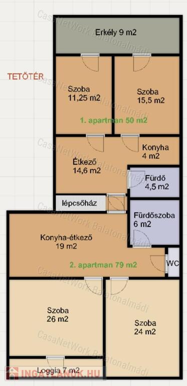 - a tetőtérben két apartman található: egy 50 m²-es, két szobás apartman 9 m²-es erkéllyel, valamint egy 79 m²-es, két szobás apartman 7 m²-es loggiával.