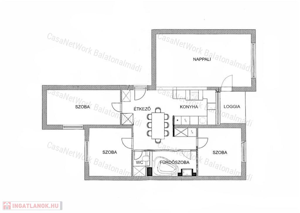- Ideális kialakítású terek: napfényes nappali, összeköttetésben a konyha-étkezővel, három hálószoba, fürdőszoba, toalett és loggia