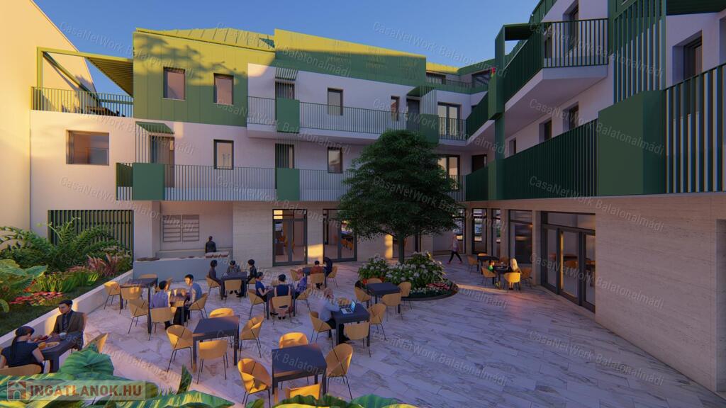- az épület földszintje ad helyet a szintén eladásra kínált étteremnek és kávézónak, melyek központi elhelyezkedésüknek és színvonalas kivitelezésüknek köszönhetően a gasztronómiai élmények és a társasági élet meghatározó elemévé válhatnak Balatonalmádiban